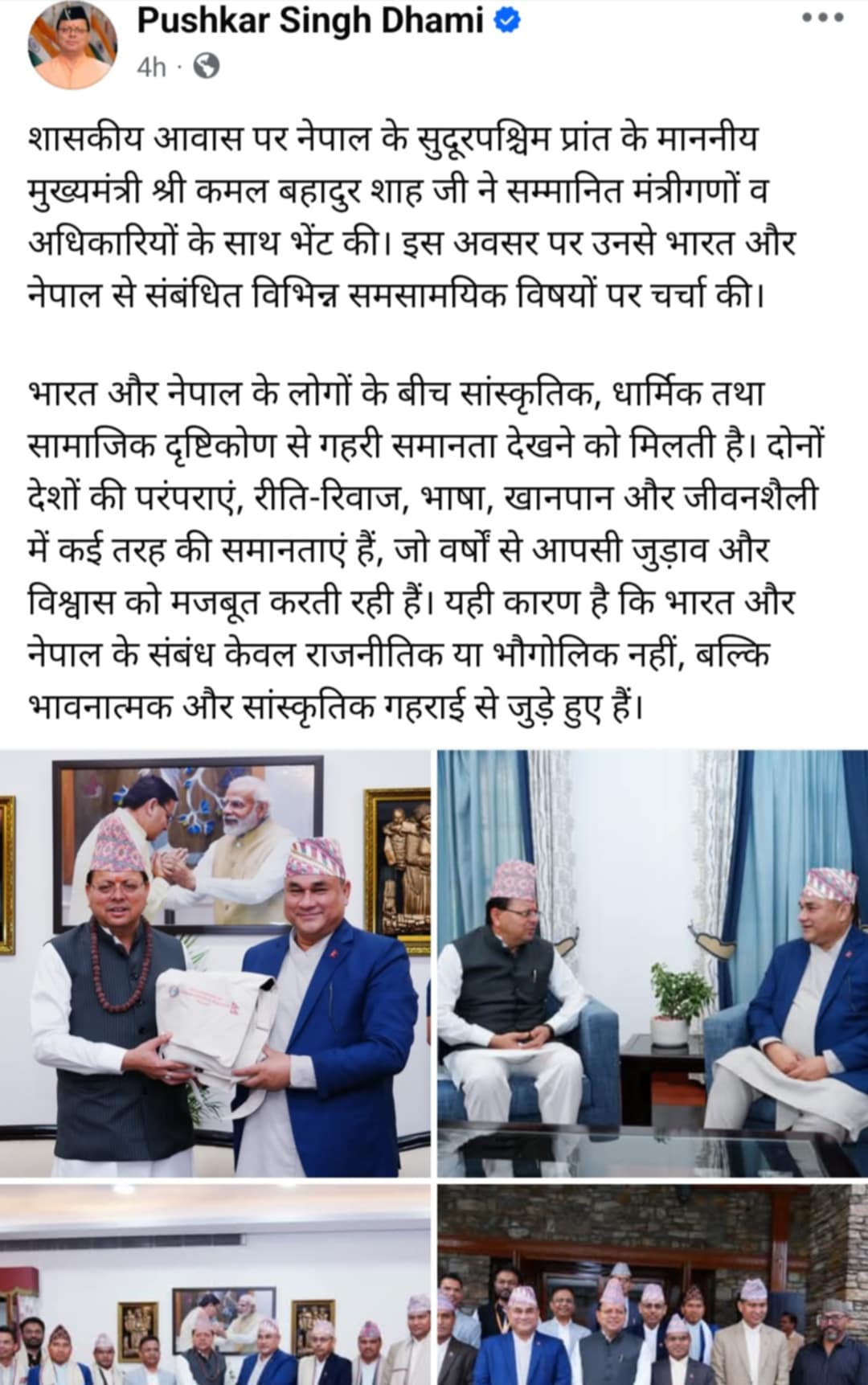 भारत र नेपालका नागरिक बिच धार्मिक, सामाजिक तथा सास्ंकृतिक दुष्टीकोणबाट गहिरो सम्बन्ध रहेको उत्तराखण्डका मुख्यमन्त्री धामीले बताए । दुई देशका परम्परा, रिति रिवाज, भाषा, खानपान र जिवनशैलीमा धेरै समानता रहेको उनको भनाई छ । बषौँ देखी रहेको आपसी सम्बन्ध र बिश्वासलाई थप मजबुत गर्नुपर्ने धामीको भनाई थियो । भारत र नेपालको सम्बन्ध केवल राजनितिक र भौगोलिक मात्र नभई भावनात्मक र सास्ंकृतिक गहिराइबाट समेत जोडिएको धामीले बताए ।