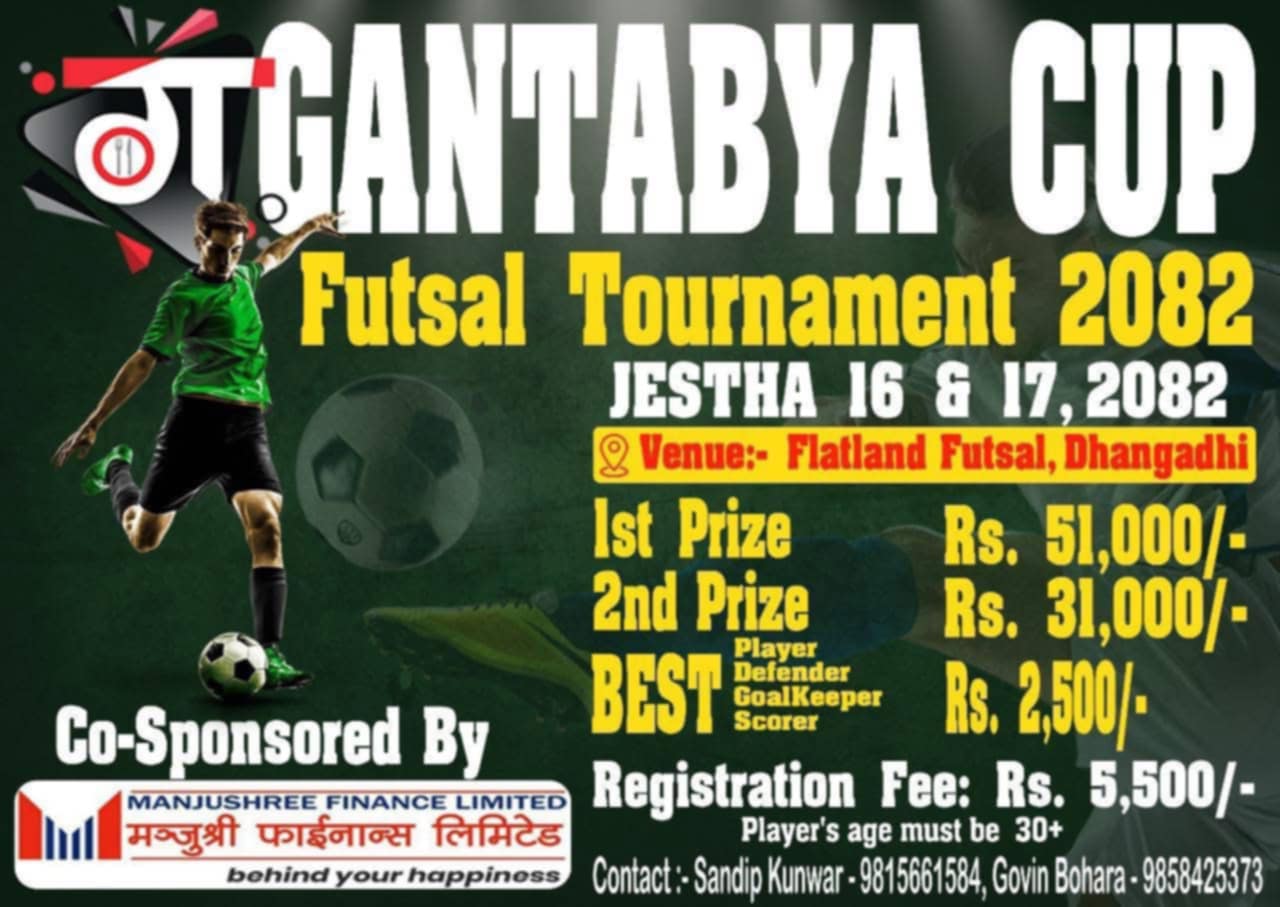धनगढी । धनगढीमा ‘गन्तव्य कप’ आयोजना हुने भएको छ । गन्तव्य क्याफेको आयोजनामा ‘गन्तव्य कप फुटसल टुर्नामेन्ट २०८२’ आयोजना हुने भएको हो । टुर्नामेन्टको सह प्रयोजक मञ्जुश्री फाइनान्स लिमिटेड रहेको छ । टुर्नामेन्ट जेठ १६ र १७ गते धनगढीको फ्ल्याटल्याण्ड फुटसलमा हुनेछ ।