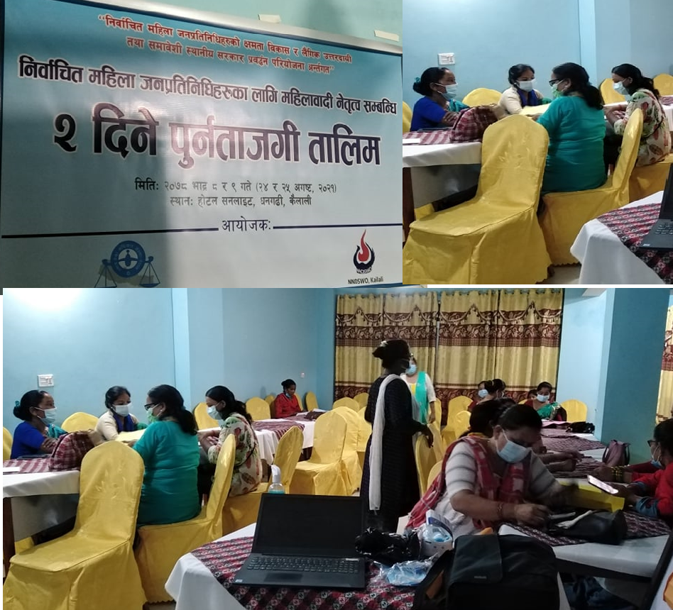 महिला जनप्रतिनिधिहरुले विगतमा यसै संस्था द्वारा प्रदान गरिएको रुपान्तरणकारी महिलाबादी नेतृत्व सम्बन्धि तालिम सो पछि गरिसकेका काम र बिगतको सिकाइलाई कति लागु गरिरहेका छन्, महिलाबादी दृष्टीकोणबाट पैरवी, जनवकालतका बिषयमा उनिहरुलाई तालिम दिइएको हो । बिगतमापनि कैलालीका ३ स्थानिय तहका २९ जना महिला जनप्रतिनिधीहरुहरुलाई तालिम दिएको संस्थाले सोही जननिर्वाचित जनप्रतिनिधीहरुलाई पुर्नताजगी तालिम दिएको हो ।