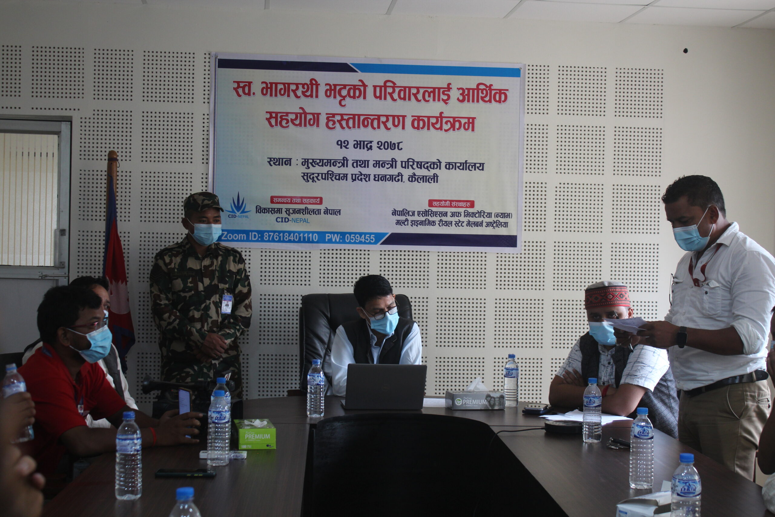 विकासमा सृजनशिलता नेपाल सिआईडी नामक संस्थाको सहकार्य र समन्वयमा उक्त रकम पिडित परिवारलाई हस्तान्त्रण गरिएको थियो । सुदूरपश्चिम प्रदेश मुख्यमन्त्री कार्यालयमा आयोजना गरेको रकम हस्तान्त्रण कार्यक्रमको अध्यक्षता संस्थाका अध्यक्ष डिल्ली भट्टले गरेका थिए ।