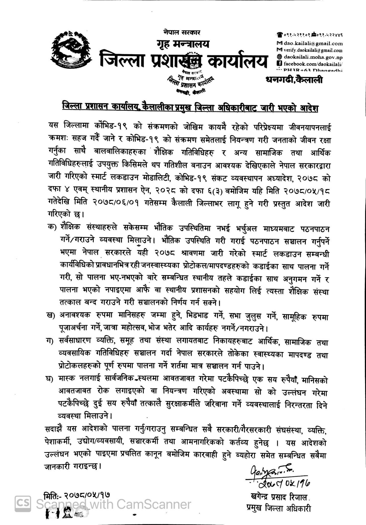 जिल्ला प्रशासन कार्यालय कैलालीले बिहिबार एक आदेश जारी गर्दै शैक्षिक संस्थाहरु सकेसम्म भौतिक उपस्थितिमा नभई भर्चुअल माध्यमबाट पठनपाठन गराउने तर, भौतिक उपस्थिति गराई पठनपाठन गराउने पर्ने भएमा स्मार्ट लकडाउन सम्बन्धी मापदण्ड अनुसार सञ्चालन गर्न भनिएको छ ।