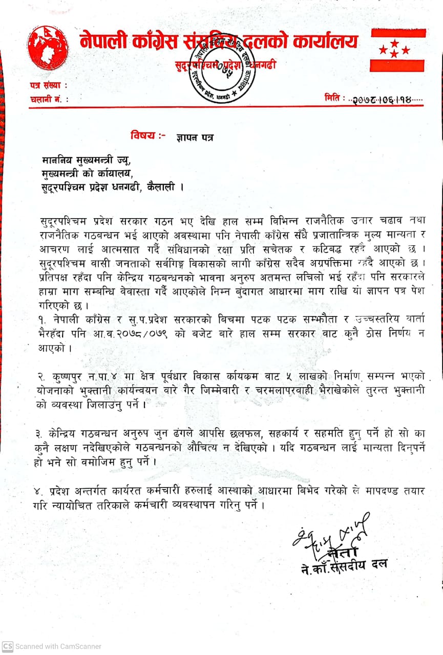 केन्द्रीय गठबन्धनको भावना अनुरूप लचिलो भइरहँदा पनि सुदूरपश्चिम प्रदेश सरकारले बेवास्ता गरेको प्रति नेपाली काँग्रेस संसदीय दलले आपत्ति छ । ज्ञापन पत्रमा भनिएको छ,‘केन्द्रिय गठबन्धन अनुरुप जुन ढंगले छलफल र सहकार्य हुनुपर्ने हो त्यसको कुनै लक्षण देखिएन।’ गठबन्धनलाई मान्यता दिनुपर्ने कांग्रेसको भनाई छ। नेपाली काँग्रेस र सुदूरपश्चिम सरकारको बिच पटक पटक सम्झौता र उच्च स्तरीय वार्ता भइरहँदा पनि आर्थिक वर्ष २०७८/७९ को बजेट बारे हालसम्म पनि सरकार बाट कुने ठोस निर्णय नआएको भन्दै ध्यानाकर्षण भएको जनाएको हो।