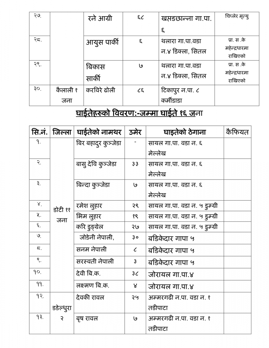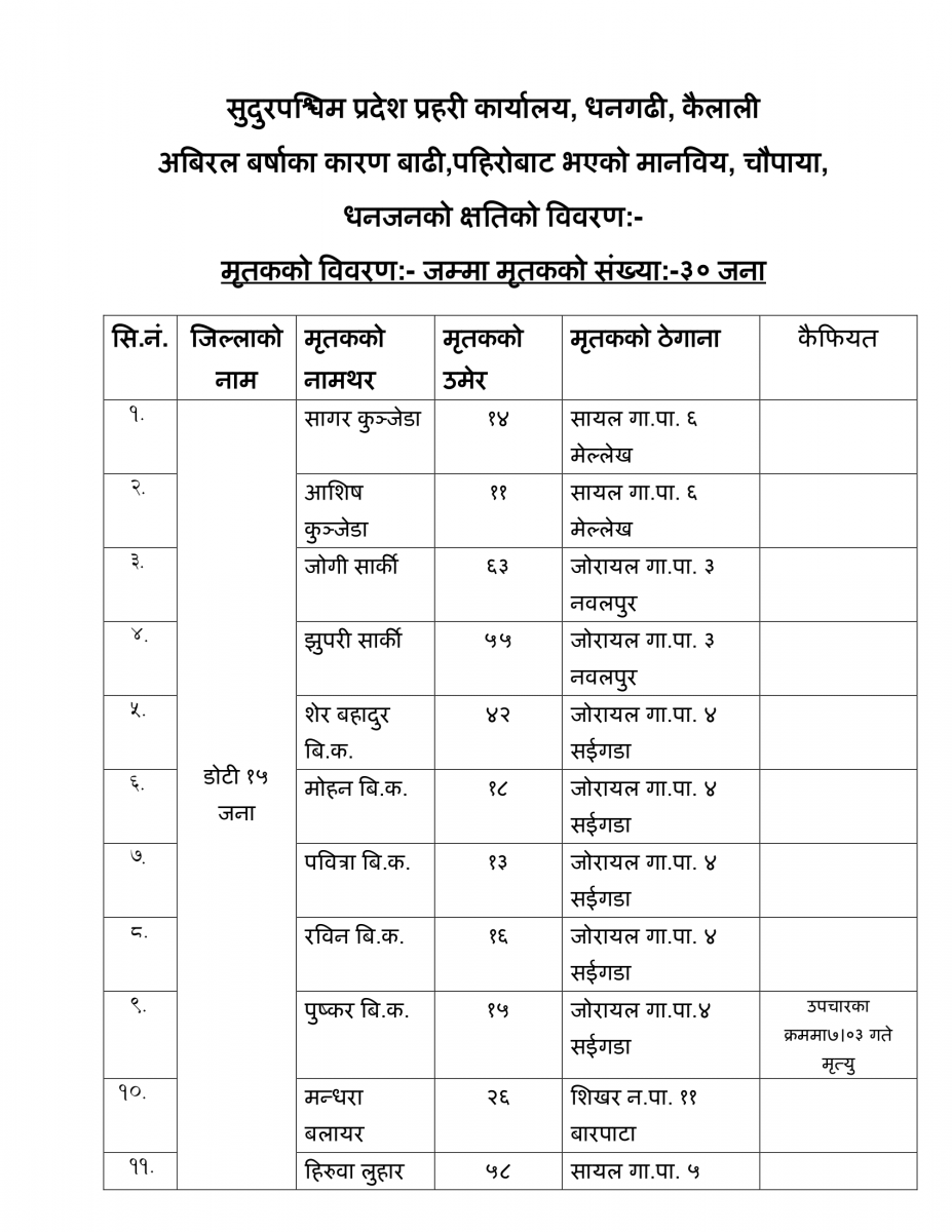 धनगढी : बाढी र पहिरोमा परी सुदूरपश्चिम प्रदेशमा मृत्यु हुनेको संख्या ३० पुगेको छ । मृत्यु हुनेमा सबैभन्दा बढी डोटीमा १५, १५, बझाङमा ८, बैतडीमा चार, डडेल्धुरामा दुई र कैलालीमा एक जना रहेका छन् ।