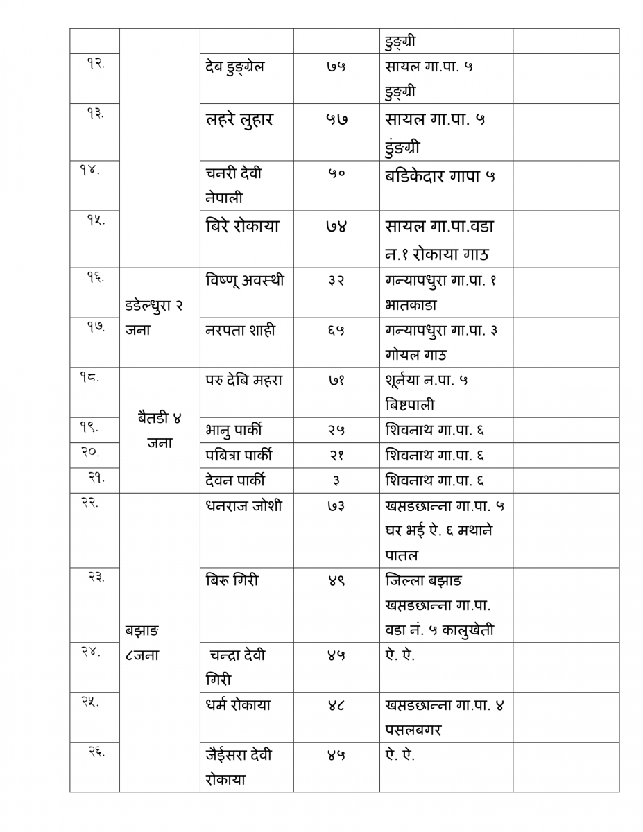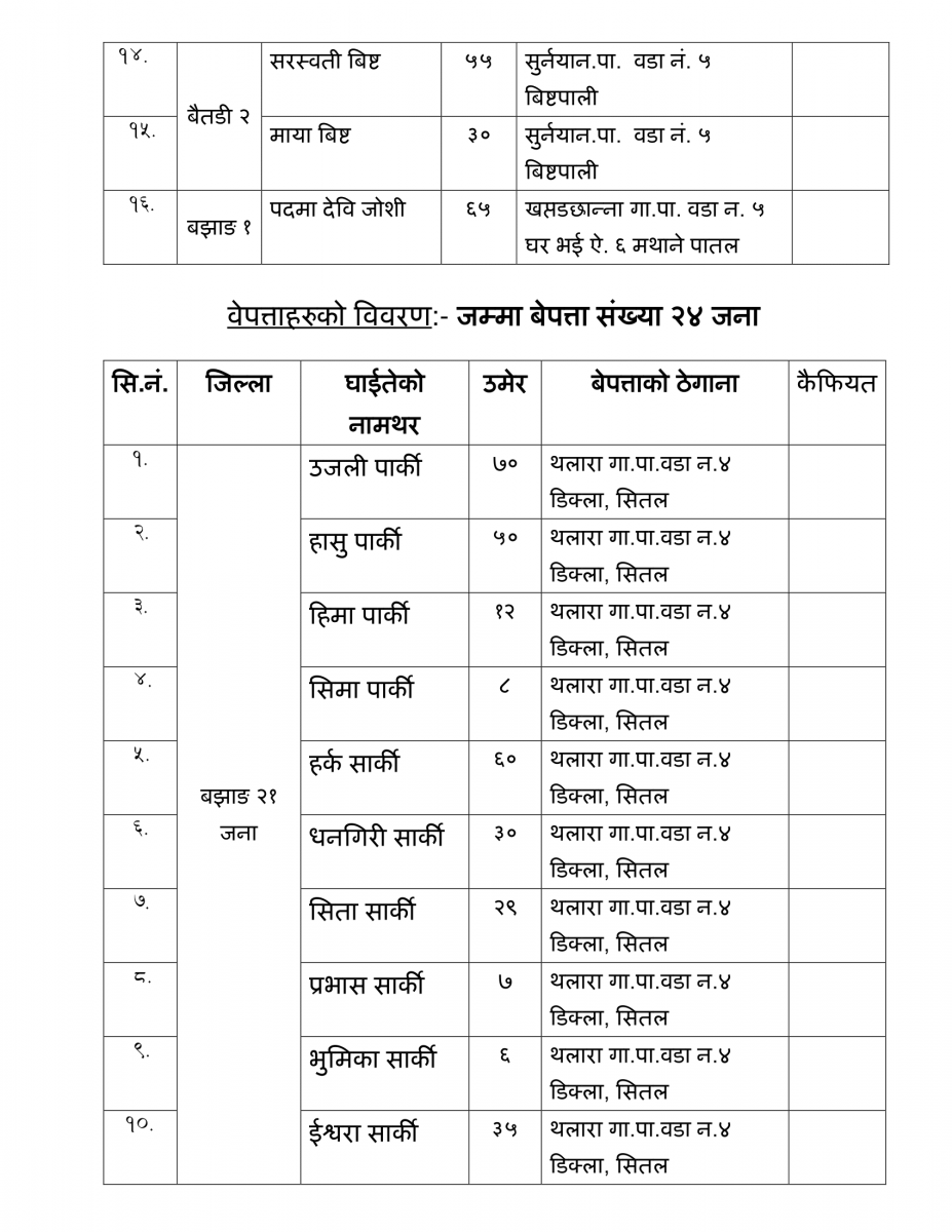 पहिरोमा परी प्रदेशभरी २४ जना बेपत्ता भएको प्रदेश प्रहरी कार्यालयले जनाएको छ । बझाङमा पहिरोमा परेकाहरुको उद्धारमा नेपाली सेना रहेको छ । सेनाले हेलिकोप्टरमार्फत पहिरोमा परेकाहरुको उद्धार र खोजी कार्य गरिरहेको छ । यस्तै बाढीपहिरोका कारण १६ जना घाइते भएका छन् ।