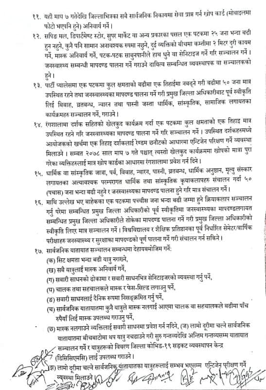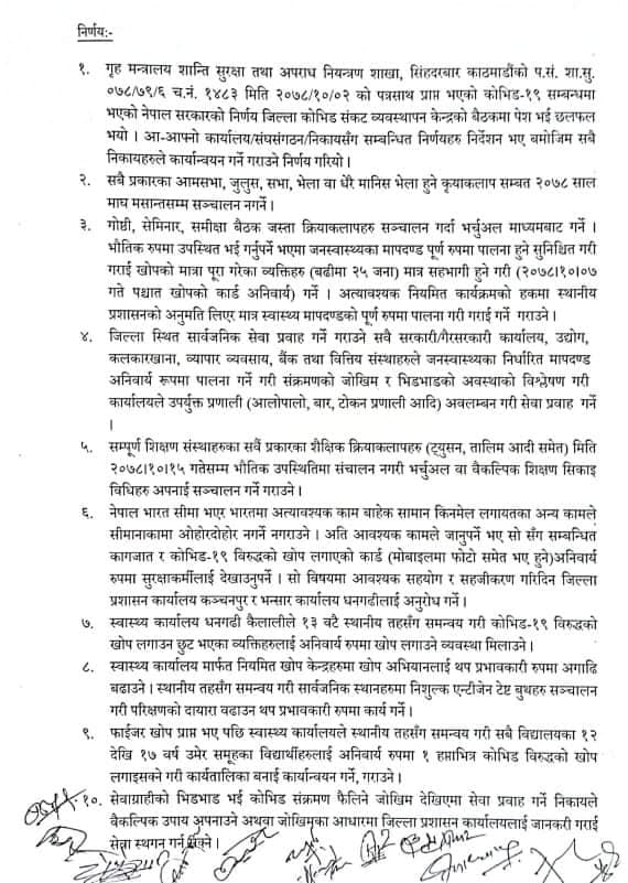 जिल्ला प्रशासन कार्यालयका सूचना अधिकारी शिवराज जोशीका अनुसार डिसीसीएमसीले २५ वटा निर्णय गरेको बताउदै भने, ‘सोही निर्णयअनुसार प्रमुख जिल्ला अधिकारी ज्यूले आदेश जारी गर्ने तयारी छ।’उनका अनुसार २५ जनाभन्दा बढी भेला हुने गरी कार्यक्रम नगर्न, होटल, रेस्टुरेन्ट, सिनेमा हल, रङ्गशाला, हवाईयात्रा, उद्यानलगायतका सार्वजनिक स्थानमा जाँदा भोलिदेखि कोभिडविरुद्धको खोप लगाएको कार्ड अनिवार्य गरिएको छ।
