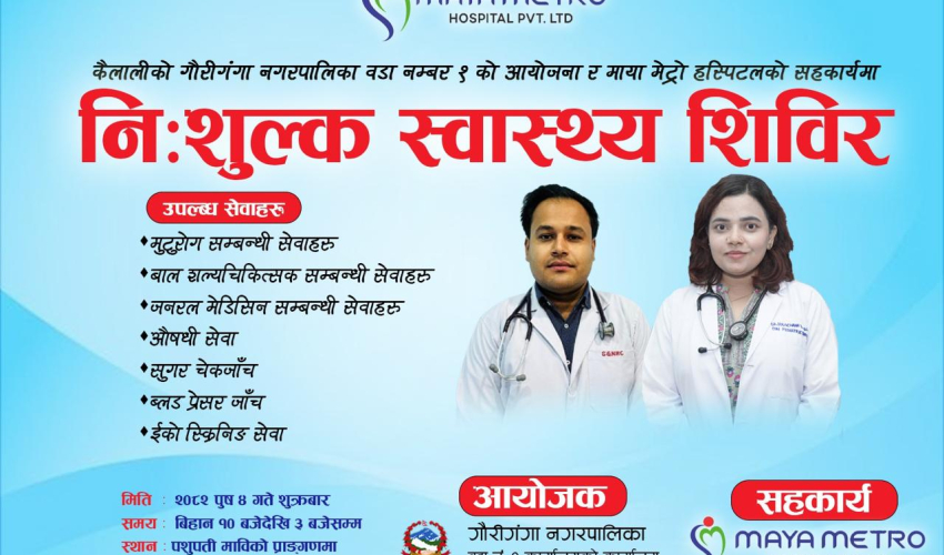 माया मेट्रो हस्पिटलको सहकार्यमा निःशुल्क स्वास्थ्य शिविर आयोजना हुने