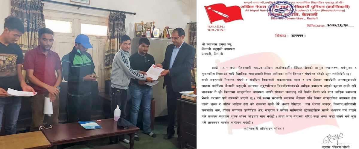 शुल्क घटाउन माग गदैँ अखिल क्रान्तिकारी कैलालीद्वारा क्याम्पस प्रमुखलाई ज्ञापनपत्र बुझायो